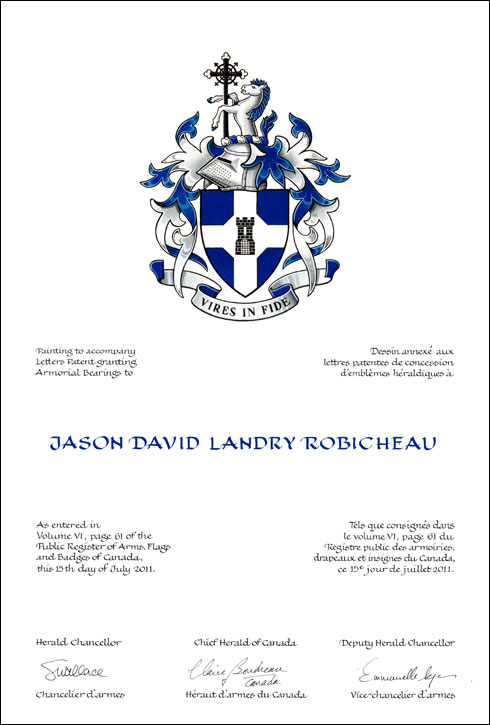 Arms of Jason David Landry RobicheauBlazonAzure on a cross nowy-lozengy Argent a tower Sable masoned Argent; SymbolismBlue and white are colours Mr. Robicheau associates with sincerity and loyalty to family. The cross represents his forefathers’ Christian faith, and its diamond-shaped centre suggests strength and the ability to withstand the trials of life. The tower symbolizes the safety and protection offered by the home. It also alludes to Mr. Robicheau’s employment as a corrections officer. |