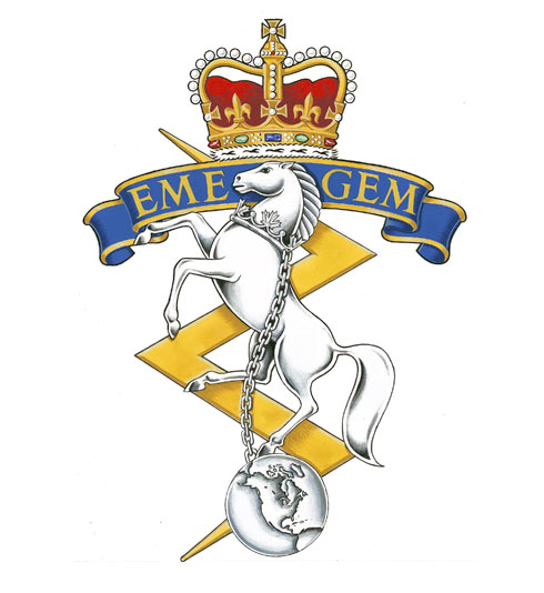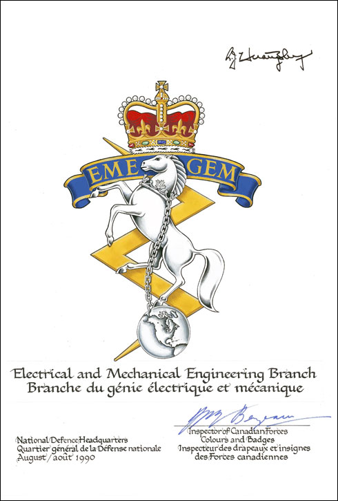 Badge of the Land Electrical and Mechanical Engineering BranchBlazonA lightning flash in pale Or surmounted near its upper tip by a scroll Azure bordered Or bearing the inscription EME and GEM in letters Or and over all a horse forcene gorged with a coronet of maple leaves and pearls a chain affixed thereto reflexed over its back standing on a representation of the Western Hemisphere all Argent the whole ensigned by the Royal Crown proper; |