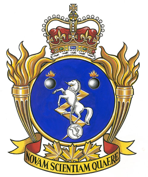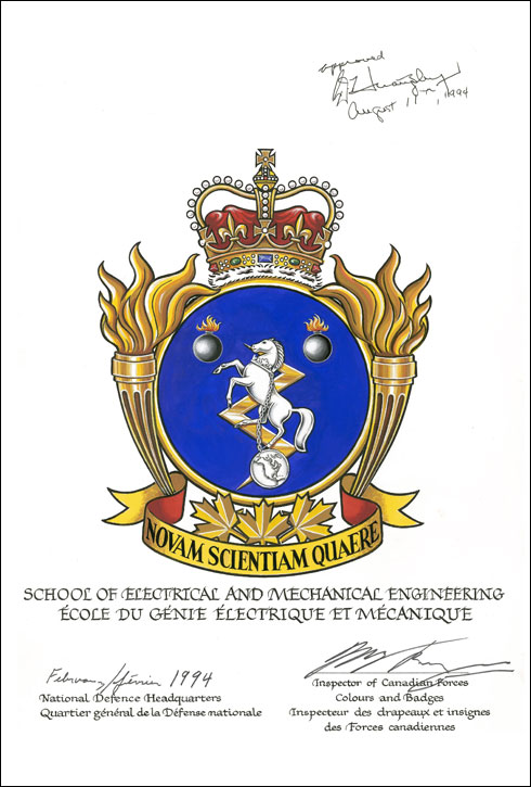 Badge of the Canadian Forces School of Electrical and Mechanical EngineeringBlazonAzure a lightning flash in pale Or over all a horse forcené gorged with a coronet of maple leaves and pearls a chain affixed thereto reflexed over its back standing on a globe depicting the Western Hemisphere all Argent in chief two grenades proper; |