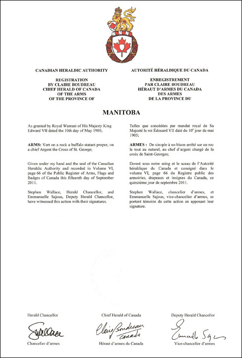 SupportersBlazonOn a mound bearing seven prairie crocuses slipped proper between to the dexter a wheat field Or and to the sinister a forest of white spruce (Picea glauca) proper the whole rising above barry wavy Argent and Azure dexter a unicorn Argent armed crined and unguled Or gorged with a mural coronet Vert masoned and encircled with maple leaves Argent pendant therefrom the wheel of a Red River cart Vert sinister a horse Argent crined queued and unguled Or gorged with a collar of Prairie Indigenous beadwork proper pendant therefrom a cycle of life medallion Vert; SymbolismThe unicorn represents the province’s early Scottish settlers. Its collar symbolizes Manitoba’s position as Canada’s “keystone” province in the centre of the country. The collar further alludes to the stones of Fort Garry, a Hudson’s Bay Company fort during the fur trade period. The maple leaves are a symbol of Canada. The wheel of a Red River cart represents a distinctive form of transport in the province’s history. The horse was an animal vital to the First Peoples, the Métis and the European settlers. The collar of Prairie Indigenous beadwork and the cycle of life medallion represent the First Nations in the province. In the compartment, the water represents the rivers and lakes in the province as well as the origins of the province’s name, which comes from the name of the Cree spirit Manitou. The grain field represents the agricultural settlement that helped the province prosper in its infancy and is a symbol of the south of the province. The forest represents the white spruce, the provincial tree, as well as the north of the province. The prairie crocuses are the provincial flower of Manitoba. |