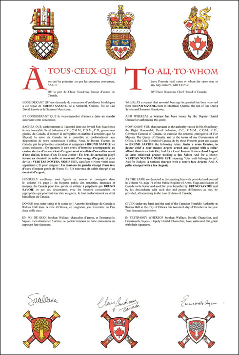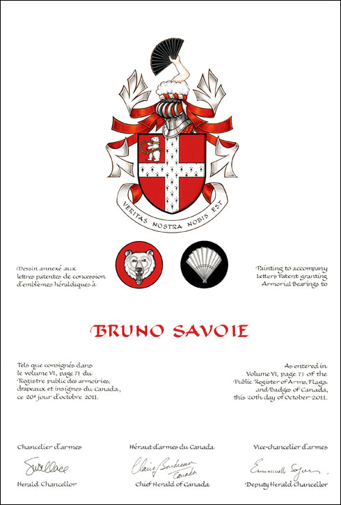 Arms of Bruno SavoieBlazonGules a cross Ermine, in dexter chief a bear statant Argent armed and gorged with a collar affixed thereto a chain Or; SymbolismThe shield, based on the arms of the Savoy region (red with a white cross), alludes to Mr. Savoie’s surname. The red colour evokes a sense of celebration of life. The bear is a symbol of courage and strength. The gold chain around its neck represents the constraints which one must overcome in order to shine. (Text revised on 9 July 2018) |