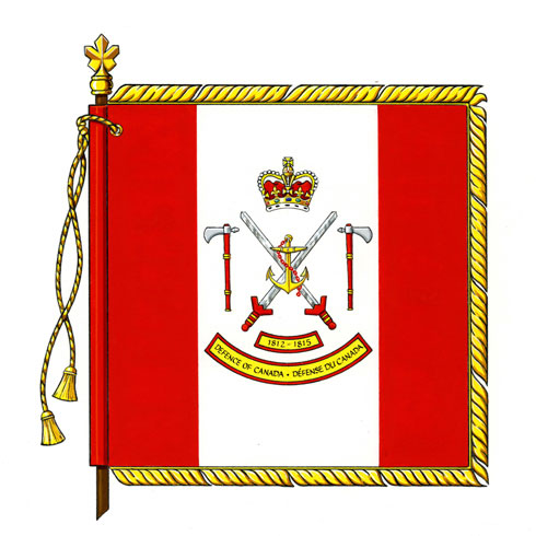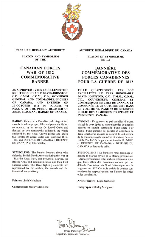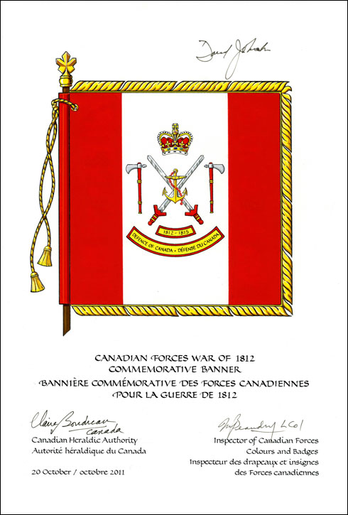 Canadian Forces War of 1812 Commemorative BannerBlazonGules on a Canadian pale Argent two swords in saltire proper, hilts and pommels Gules, surmounted by an anchor Or fouled Gules and flanked by two tomahawks addorsed, the whole ensigned by the Royal Crown proper and above two scrolls Or edged Gules and inscribed 1812-1815 and DEFENCE OF CANADA • DÉFENSE DU CANADA in letters Sable; SymbolismThe banner honours those who defended British North America during the War of 1812: the Royal Navy and Provincial Marine, the British Army and colonial militias, and their First Nations allies. The three fighting elements are represented by the anchor, the swords and the tomahawks respectively. |
