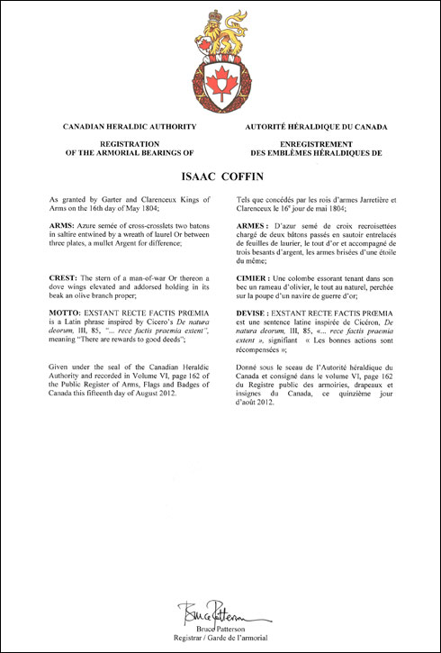 The contents of this Register are intended for research purposes only. The heraldic emblems found in the Register may not be reproduced in any form or in any media without the written consent of the Canadian Heraldic Authority and/or the recipient.