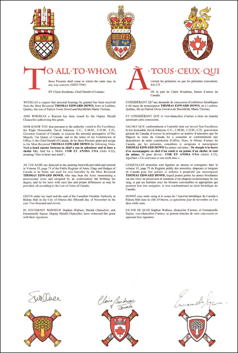 Additional InformationCreator(s)Original concept of Thomas Edward Dowd, assisted by the heralds of the Canadian Heraldic Authority. PainterGordon Macpherson CalligrapherDoris Wionzek Recipient TypeIndividual |