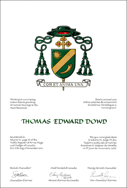 Arms of Thomas Edward DowdBlazonVert a bend sinister between in chief a sun in splendour and in base a shofar Or; SymbolismGreen and gold are the colours of many Dowd arms in Ireland, Bishop Dowd’s ancestral homeland. Green is also the colour of hope and gold the colour of the glory of heaven. The diagonal band symbolizes a deacon’s stole which is the mark of a servant. The sun recalls the “sun of justice” described by the biblical prophet Malachi. The shofar is a horn symbolizing the action of announcing the glory of God and the coming day of the Lord. |