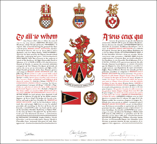 The contents of this Register are intended for research purposes only. The heraldic emblems found in the Register may not be reproduced in any form or in any media without the written consent of the Canadian Heraldic Authority and/or the recipient.