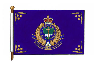 Flag of the Peterborough Lakefield Community Police ServiceBlazonAzure the Badge cantoned by bezants and quill pens Or; SymbolismThe ceremonial flag includes quill pens to allude to Lakefield’s being a cradle of literary culture in Upper Canada. The gold discs in each corner allude to the Robinson crest, a deer strewn with gold discs. |