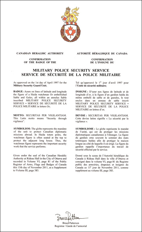 Additional InformationCreator(s)Not available PainterDebra MacGarvie CalligrapherShirley Mangione Recipient TypeMilitary Institution Other InformationThe recipient's emblems were originally recorded in the name of Military Security Guard Unit in the Public Register of Arms, Flags and Badges of Canada, Volume III, page 383, 1 April 1997. |