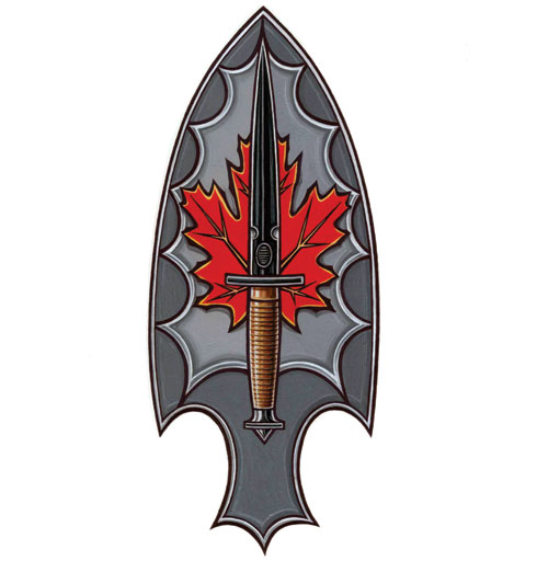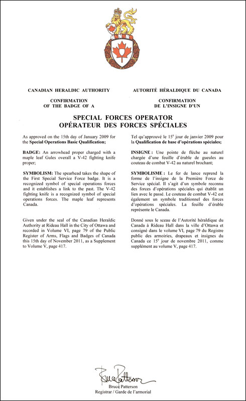 Badge of a Special Forces OperatorBlazonAn arrowhead proper charged with a maple leaf Gules overall a V-42 fighting knife proper; SymbolismThe spearhead takes the shape of the First Special Service Force badge. It is a recognized symbol of special operations forces and it establishes a link to the past. The V-42 fighting knife is a recognized symbol of special operations forces. The maple leaf represents Canada. |
