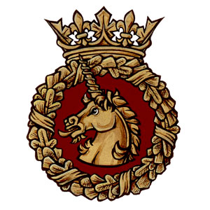 Badge of the University Club of MontrealBlazonOn a torteau environed by a wreath of conifer branches, a unicorn’s head couped, all ensigned by a coronet of maple leaves and fleurs-de-lis Or; SymbolismThis takes elements from the arms and the supporters along with a wreath based on decorative elements in the University Room of the club. The wreath is a symbol of accomplishment, and by being bound together it also indicates unity. |