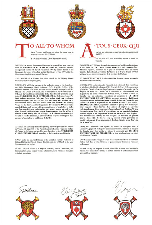 SupportersBlazonTwo unicorns Or crined and unguled Gules each gorged with a coronet Azure of maple leaves Gules and fleurs-de-lis Azure and standing on a grassy mount set with grape vines fructed and leaved and poppy flowers proper; SymbolismThe unicorn is a creature of imagination and mystery, a symbol of strength and purity. The coronets of maple leaves and fleurs-de-lis indicate the Canadian identity of the club as well as the francophone aspect of its membership. The poppy flowers allude to one of the club’s founders, Dr. John McRae, who wrote the poem of remembrance “In Flanders Fields”. The grape vines symbolize hospitality in general as well as the club’s growing reputation for fine dining and its extensive wine collection. |