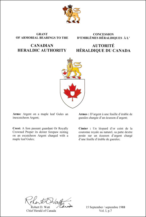 The contents of this Register are intended for research purposes only. The heraldic emblems found in the Register may not be reproduced in any form or in any media without the written consent of the Canadian Heraldic Authority and/or the recipient.