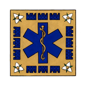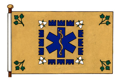 Badge of the Ontario Association of Paramedic ChiefsBlazonOn a square Or the star of life Azure, its rod of Aesculapius Or, environed of twelve mural coronets forming a square Azure, at each angle a trillium flower barbed and seeded proper; SymbolismThe emblem of a blue cross with the Rod of Aesculapius is commonly used by emergency medical services. The trillium flowers represent Ontario, and the mural coronets, a traditional symbol of municipal government. Together, these symbols represent the leadership of paramedics providing pre-hospital medical care. |