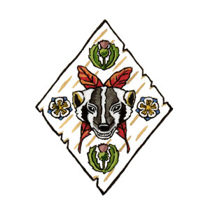 Badge of Daniel Heath JusticeBlazonOn a birchbark lozenge a badger’s face proper surmounting two quills in saltire Gules between two thistles in pale and two columbine flowers in fess proper; SymbolismThe badge repeats the badger symbolism of the crest with another reference to Prof. Justice’s work as a writer and teacher. The thistles refer to the Scottish heritage of Prof. Justice’s partner, Kent Dunn, and the columbine flowers, the state flower of Colorado, refers to Prof. Justice’s original home. |