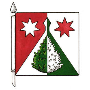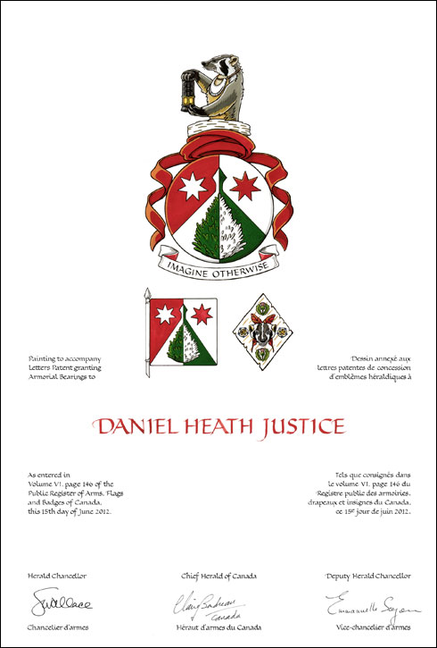 Arms of Daniel Heath JusticeBlazonPer chevron its apex a spear head, in chief per pale Gules and Argent, two mullets of seven points counterchanged, in base per pale Argent and Vert a red cedar tree counterchanged; SymbolismRed and white are the colours of Canada. Representing war and victory on the one hand and peace and completion on the other, they are also significant colours of the Cherokee Nation, of which Professor Justice is a member. Red also alludes to the red soil of Colorado, where he was raised. The seven-pointed stars are a familiar symbol of the Cherokee Nation, seven being a significant number in their culture. The spear head shape refers to Prof. Justice’s paternal descent from the Spears family. It also resembles a pen nib, an allusion to his work as a writer, editor and mentor, as well as to the Schrvyer (meaning “scribe”) name of his maternal family line. The division line evokes the Rocky Mountains of Colorado, where he grew up. The red cedar alludes to the idea of the tree of life, as well as Prof. Justice’s love of nature. Green represents growth. The round shield reflects the traditional shape of Cherokee war shields. |