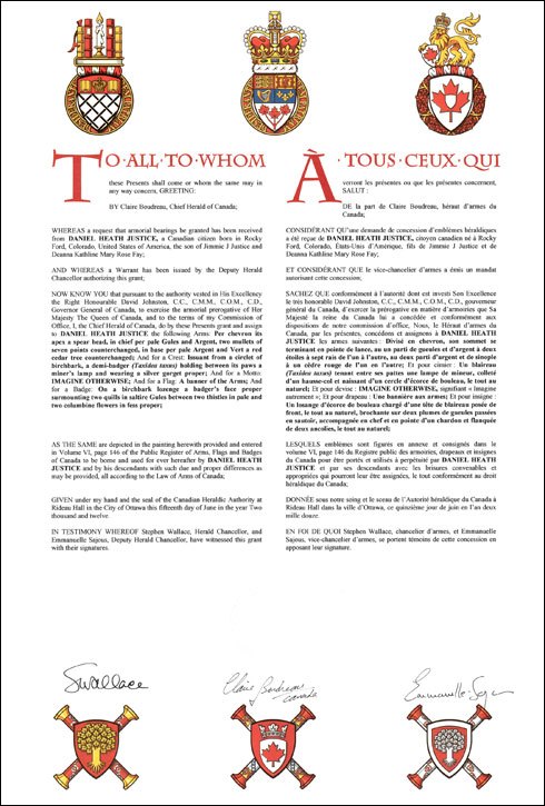 CrestBlazonIssuant from a circlet of birchbark, a demi-badger (Taxidea taxus) holding between its paws a miner’s lamp and wearing a silver gorget proper; SymbolismThe badger is an important animal for Prof. Justice, whose research interests include the cultural history of badgers. The gorget is another reference to his heritage, as these items, originally protective gear in European military vesture, came to be worn by persons of authority within North American First Nations. Its shape is that of a silver crescent moon, something that holds particular meaning for Professor Justice. The miner’s lamp represents the protected fire of knowledge; the sacred fire of the Cherokee people; and Victor, Colorado, the “City of Mines”, where Prof. Justice grew up and where his parents live. It also alludes to his descent through his mother from the Sparks family. The birch bark, an early medium for recording, refers to Prof. Justice’s work in writing and scholarship, notably in the field of Indigenous literature. The turban, which is a substitute for the wreath and mantling, is a distinctive historical Cherokee form of headgear. |