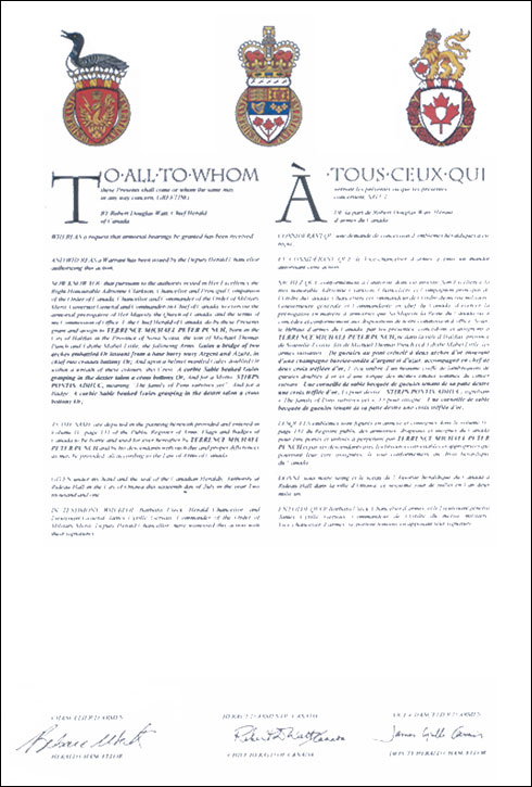 Additional InformationCreator(s)Original concept of Darrel Kennedy, Assiniboine Herald, assisted by the Heralds of the Canadian Heraldic Authority PainterDavid Farrar CalligrapherNancy Ellis Recipient TypeIndividual |