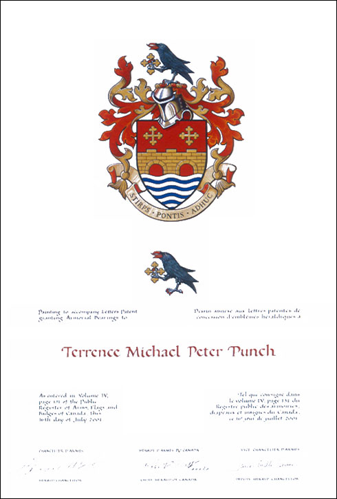 Arms of Terrence Michael Peter PunchBlazonGules a bridge of two arches embattled Or issuant from a base barry wavy Argent and Azure, in chief two crosses bottony Or; SymbolismThe bridge refers to the name Punch, which was originally the French surname of Pons, the Latin word for “bridge”. The water base symbolizes the ocean, and the two crosses represent the continents of Europe and America as well as the family’s Christian faith. |