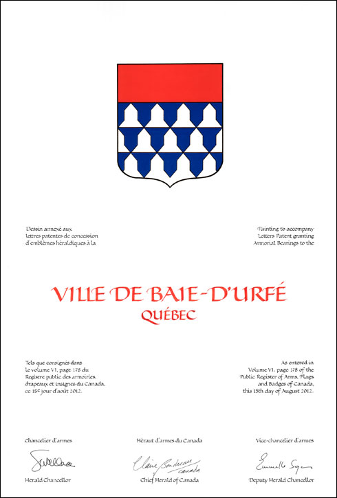 Arms of the Ville de Baie d'UrféBlazonVair a chief Gules; SymbolismThe arms were borne by François-Saturnin Lascaris d’Urfé (1641-1701), a Sulpician missionary and the first resident priest of Saint-Louis-du-Haut-de-l’Île, the site of the present-day town of Baie-d’Urfé. The last member of the Lascaris d’Urfé family died in 1794, and the town has used the arms since 1960 to honour its association with the family. The unusual arrangement of the vair pattern at the base of the arms replicates their rendering on a silver cup once owned by François-Saturnin Lascaris d’Urfé, now in the collection of the Notre-Dame Basilica of Montreal. According to tradition, the arms were granted to Wlphe le Robuste, the progenitor of the family of Lascaris d’Urfé, to honour his participation in the Siege of Antioch in 1098. In battle, Wlphe wore a coat of scarlet lined with squirrel fur, the heraldic “vair”, and this coat inspired the design. |