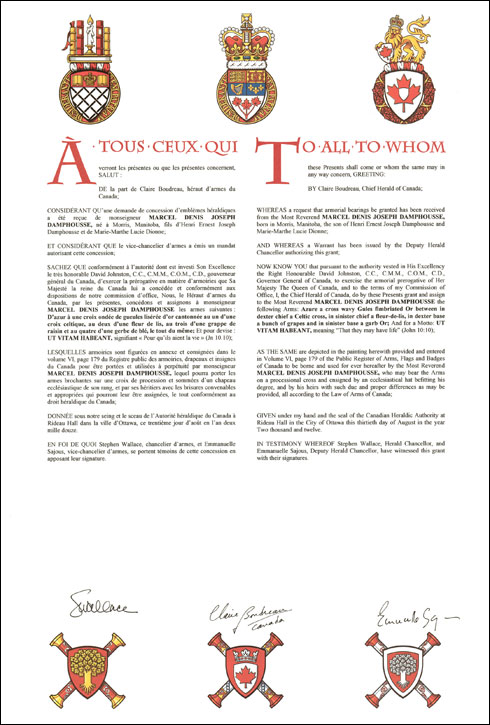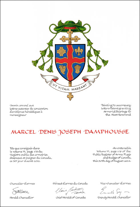 Arms of Marcel Denis Joseph DamphousseBlazonAzure a cross wavy Gules fimbriated Or between in dexter chief a Celtic cross, in sinister chief a fleur-de-lis, in dexter base a bunch of grapes and in sinister base a garb Or; SymbolismThe blue refers to the sky of the Canadian prairies, where Bishop Damphousse was born and raised. It also alludes to Quebec, the home of his first Canadian ancestors. The wavy red cross refers to the Red River in Bishop Damphousse’s home province of Manitoba. The water imagery also signifies the St. Lawrence and Ottawa rivers bordering the Diocese of Alexandria-Cornwall, as well as the waters of baptism. The Celtic cross is a feature of St. Boniface Cathedral in Manitoba, of which Bishop Damphousse was parish priest prior to his elevation to the episcopate. The fleur-de-lis refers to his French ancestry as well as to the many Franco-Ontarians in the diocese of Alexandria-Cornwall. The bunch of grapes is found on the arms of the Dionne family association, being a pun on the name Dionysus, the Greek god of wine. It therefore refers to Bishop Damphousse’s mother, whose surname was Dionne. The garb of wheat refers to the farming background of his family in Manitoba, and to the agricultural base of the Diocese of Alexandria-Cornwall. The grapes and wheat are also symbols of the wine and bread of the Eucharist. |