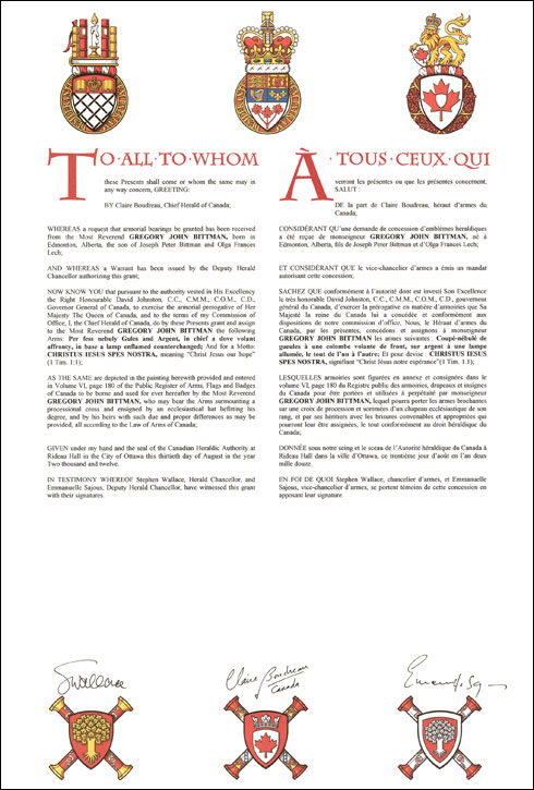 Arms of Gregory John BittmanBlazonPer fess nebuly Gules and Argent, in chief a dove volant affronty, in base a lamp enflamed counterchanged; SymbolismRed is a colour found in the arms or flags of Germany, Austria, Hungary, and Poland, thus marking Bishop Bittman’s ancestry. Red and white are the colours of Canada. The dove is the attribute of Pope St. Gregory the Great, thus alluding to Bishop Bittman’s first name as well as the fact that he was ordained a bishop on the feast day of St. Gregory. The dove is also a symbol of the Holy Spirit, of peace and love, and of the faithful. Its depiction in the arms is based on a stained glass window in St. Peter’s Basilica, Rome, thus connecting Bishop Bittman’s exercise of the apostolic ministry of a bishop with St. Peter, numbered as the first apostle. The lamp is a symbol of nursing, a reference to Bishop Bittman’s profession as a Registered Nurse prior to his reception of holy orders. A lamp is also a Christian symbol, a metaphor for the Word of God. Its flame alludes to the flames above the disciples’ heads on the day of Pentecost to the shape of a bishop’s mitre, and to the enflamed Sacred Heart of Jesus, marking the fact that Bishop Bittman was ordained a deacon on the Feast of the Sacred Heart. The division line resembling clouds alludes to the Feast of the Assumption of the Blessed Virgin Mary, on which Bishop Bittman was ordained a priest. |