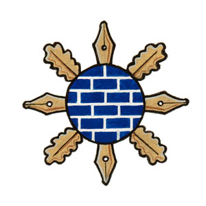 Badge of Jonathan Hardt BrickwoodBlazonA hurt masoned Argent irradiated of fountain pen nibs and oak leaves Or; SymbolismThe field of masoned bricks and the oak leaves recall the shield. The fountain pen nibs identify Mr. Brickwood as a collector of fountain pens and as a writer of history and historical fiction. The overall shape of the badge suggests the sun or a timepiece, a reference to the motto and to Mr. Brickwood’s collection of pocket watches. |
