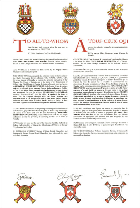 The contents of this Register are intended for research purposes only. The heraldic emblems found in the Register may not be reproduced in any form or in any media without the written consent of the Canadian Heraldic Authority and/or the recipient.