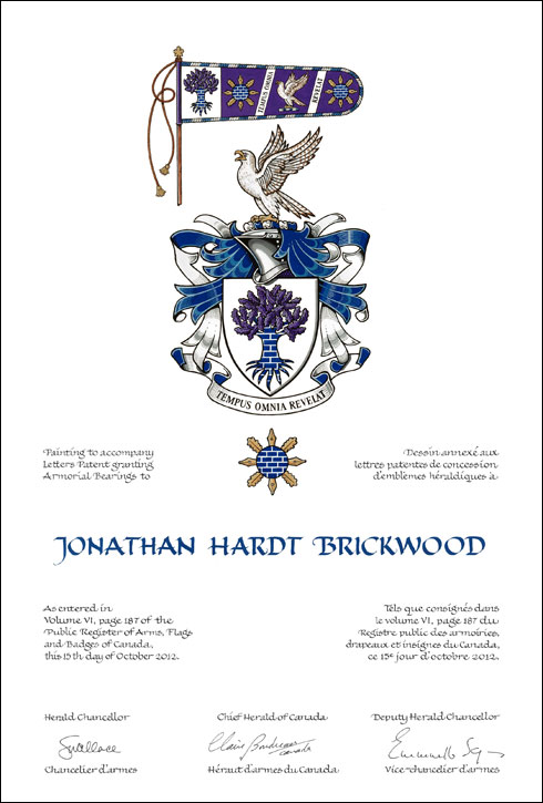Arms of Jonathan Hardt BrickwoodBlazonArgent an oak tree eradicated Azure masoned Argent its leaves Purpure; SymbolismThe oak is a traditional emblem of both England and Germany and symbolizes Mr. Brickwood’s paternal and maternal ancestry. A tree closely associated with the British monarchy, it represents Mr. Brickwood’s loyalty to the Crown and his active involvement in monarchist causes. Oak trees also grow in Queen’s Park in Toronto, seat of the Legislative Assembly of Ontario, where Mr. Brickwood works. Purple is a colour associated with royalty, and blue is Mr. Brickwood’s favourite colour. The brickwork pattern of the trunk is a pun on Mr. Brickwood’s surname. |