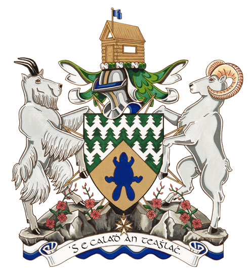 SupportersBlazonDexter a mountain goat sinister a Dall sheep both standing on a rocky mount set with fireweed plants proper above barry-wavy Argent and Azure; SymbolismThe mountain goat and Dall sheep are animals that inhabit the mountains of Yukon. Together with the rocky base they indicate Commissioner Phillips’s love of mountaineering. The fireweed is the territorial floral emblem, and it alludes to his interest in gardening. The wavy stripes represent Yukon’s many rivers and his love of fishing. |