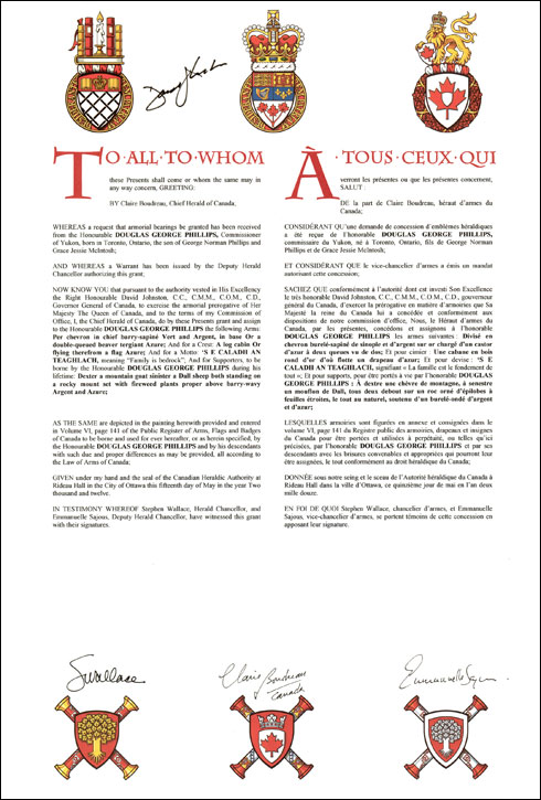 Additional InformationCreator(s)Original concept of Bruce Patterson, Deputy Chief Herald of Canada, assisted by the heralds of the Canadian Heraldic Authority. PainterCatherine Fitzpatrick CalligrapherShirley Mangione Recipient TypeIndividual Special DesignationTerritorial Commissioner |