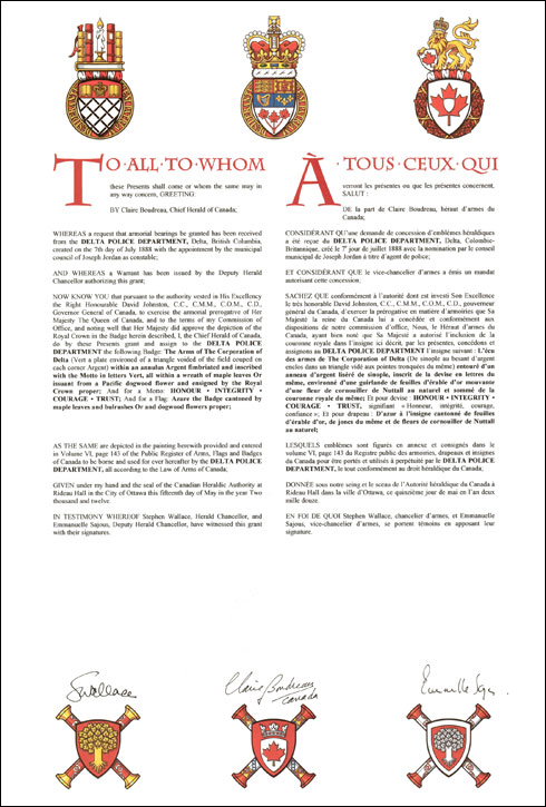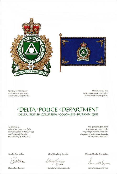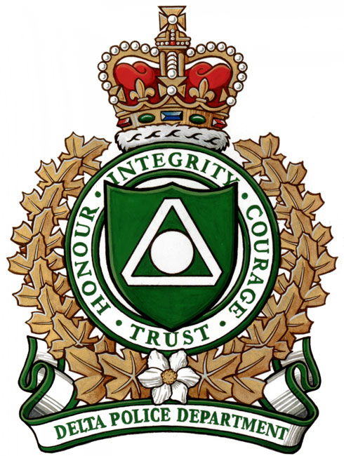 Badge of the Delta Police DepartmentBlazonThe Arms of The Corporation of Delta (Vert a plate environed of a triangle voided of the field couped on each corner Argent) within an annulus Argent fimbriated and inscribed with the Motto in letters Vert, all within a wreath of maple leaves Or issuant from a Pacific dogwood flower and ensigned by the Royal Crown proper; SymbolismThe design follows the basic pattern for Canadian municipal police badges. The shield of the municipality of Delta represents the community that the department serves, while the maple leaves and dogwood flower symbolize the department’s service to Canada and British Columbia respectively. The Royal Crown refers to the Delta Police Department’s commitment to uphold the Crown’s peace. |