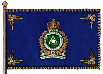 Flag of the Delta Police DepartmentBlazonAzure the Badge cantoned by maple leaves and bulrushes Or and dogwood flowers proper; SymbolismBlue is a colour frequently associated with police forces. The dogwood flowers and maple leaves in the corners supplement those on the badge and further emphasize the department’s service to the province and the nation. Bulrushes symbolize the Corporation of Delta, which features them in its municipal logo. |
