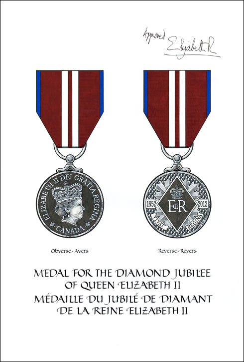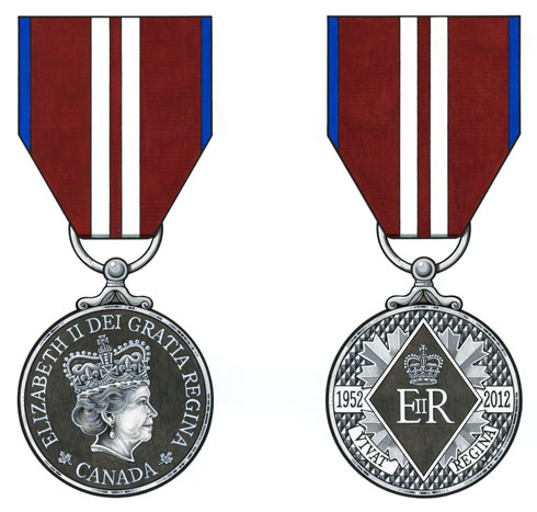 Queen Elizabeth II's Diamond Jubilee MedalBlazonSuspended by a claw affixed to a clasp Argent from a ribbon Gules edged Azure bearing in the centre two pallets Argent, a medal Argent the obverse bearing a contemporary effigy of Her Majesty The Queen of Canada contourné, wearing the Royal Crown and environed by the inscriptions ELIZABETH II DEI GRATIA REGINA and CANADA separated by two maple leaves, the reverse on a diamond-cut field a bar inscribed 1952 and 2012, overall a lozenge charged with the Royal Cypher of Her Majesty The Queen set on four maple leaves in saltire, the two in base each surmounted by a scroll inscribed VIVAT and REGINA respectively; SymbolismThe obverse depicts a crowned image of the Sovereign, in whose name the medal is bestowed. The reverse marks the sixtieth, or diamond, anniversary of the accession to the Throne of Her Majesty Queen Elizabeth II. The anniversary is expressed by the central diamond shape, by the background composed of a pattern of diamonds, and by the two dates. The Royal Cypher, being the Royal Crown above the letters EIIR (i.e., Elizabeth II Regina, the latter word in Latin meaning “Queen”), identifies the Sovereign being honoured. The maple leaves refer to Canada, while the motto VIVAT REGINA means “Long live The Queen!”. The ribbon uses a new arrangement of the blue, red and white colours found in the ribbons of the 1953 Coronation Medal, the 1977 Silver Jubilee Medal, and the 2002 Golden Jubilee Medal. |