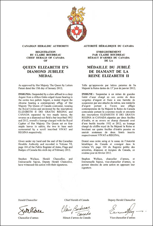 Other InformationThe Queen Elizabeth II's Diamond Jubilee Medal was approved by Her Majesty The Queen by Letters Patent dated 13 January 2012. |