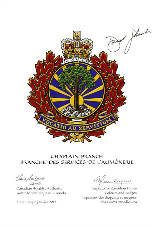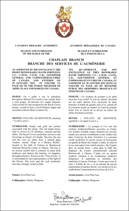Badge of the Chaplain BranchBlazonOn a golpe a sun in splendour throughout debased Or overall a tree issuant from a rock proper, all between two maple branches Gules bound Or and ensigned by the Royal Crown proper, overall in base a scroll Purpure edged and inscribed with the Motto in letters Or; SymbolismPurple and gold are colours associated with the clergy. The red maple leaves refer to service to CF members, veterans and the fallen. The Royal Crown symbolizes service to the Sovereign as Queen of Canada. The tree, the sun and the rock are taken from a stained glass window, named “Hope in a Broken World”, located in the Hall of Colours at Beechwood National Memorial Centre in Ottawa. The tree is an ancient symbol that is common in many faith traditions and depicts the ministry of chaplains throughout history. Known as the “Tree of Life”, it is surrounded by rays representative of the light of the Divine. The roots and the rock symbolize activities strongly rooted in faith. |