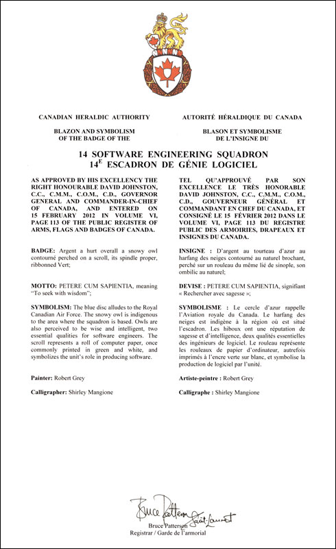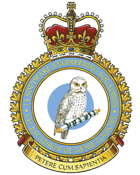 Badge of the 14 Software Engineering SquadronBlazonArgent a hurt overall a snowy owl contourné perched on a scroll, its spindle proper, ribbonned Vert; SymbolismThe blue disc alludes to the Royal Canadian Air Force. The snowy owl is indigenous to the area where the squadron is based. Owls are also perceived to be wise and intelligent, two essential qualities for software engineers. The scroll represents a roll of computer paper, once commonly printed in green and white, and symbolizes the unit’s role in producing software. |
