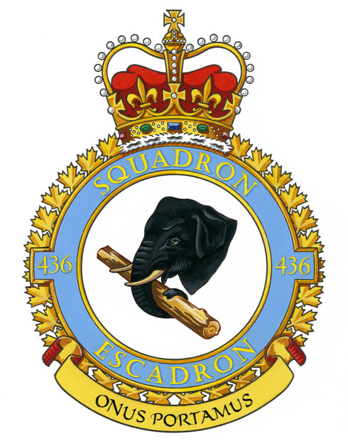 Badge of the 436 Transport SquadronBlazonArgent an elephant’s head couped Sable armed and carrying a log in its trunk Or; SymbolismThe elephant carrying a log recalls the squadron’s service as a transport unit from a base in India during the Second World War. |