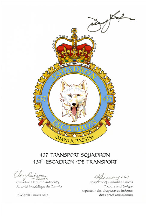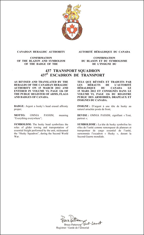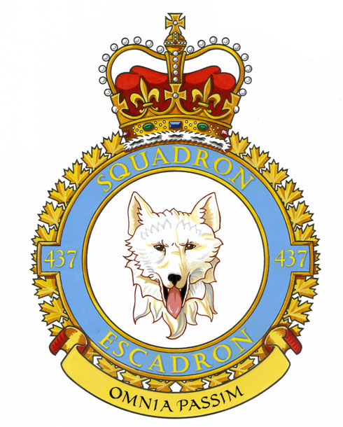 Badge of the 437 Transport SquadronBlazonArgent a husky’s head erased affronty proper; SymbolismThe husky head symbolizes the roles of glider towing and transportation of essential freight performed by the unit, nicknamed the “Husky Squadron”, during the Second World War. |