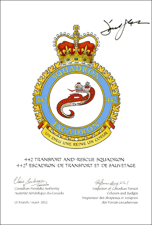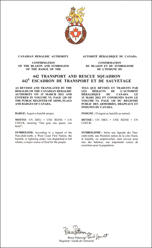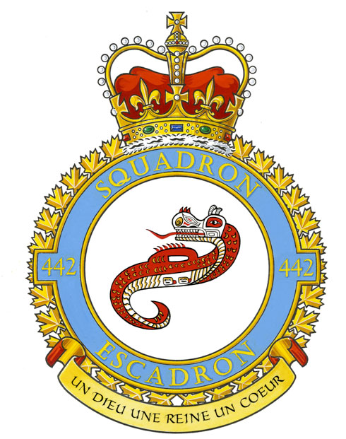 Badge of the 442 Transport and Rescue SquadronBlazonArgent a haietlik proper; SymbolismAccording to a legend of the Nuu-chah-nulth, a West Coast First Nation, the haietlik, or lightning snake, was dispatched to kill whales, a major source of food for the people. |