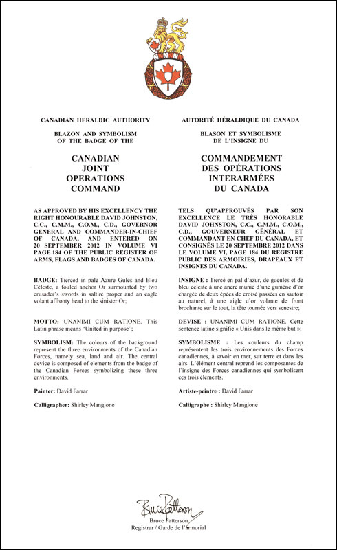 The contents of this Register are intended for research purposes only. The heraldic emblems found in the Register may not be reproduced in any form or in any media without the written consent of the Canadian Heraldic Authority and/or the recipient.