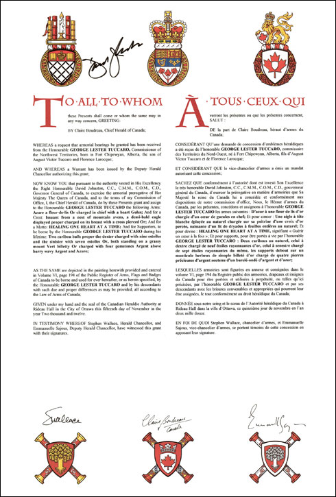 Additional InformationCreator(s)Original concept of Darrel Kennedy, Assiniboine Herald, assisted by the heralds of the Canadian Heraldic Authority. PainterLinda Nicholson CalligrapherShirley Mangione Recipient TypeIndividual Special DesignationTerritorial Commissioner |