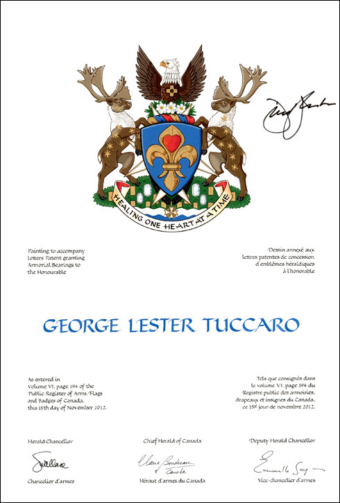 Arms of George Lester TuccaroBlazonAzure a fleur-de-lis Or charged in chief with a heart Gules; SymbolismThe blue, red and yellow colours are taken from the coat of arms and the flag of the Northwest Territories, of which Mr. Tuccaro is Commissioner. The fleur-de-lis alludes to Mr. Tuccaro’s French heritage from his mother. The heart represents members of the community and connects to the motto. |
