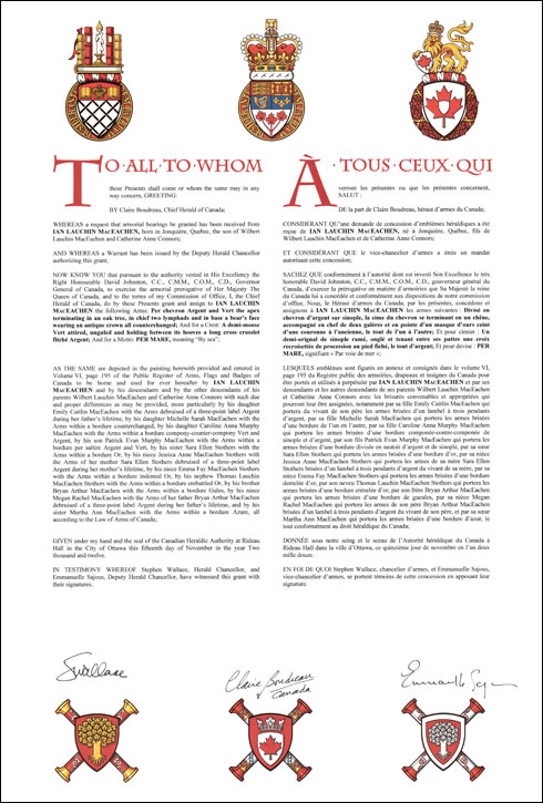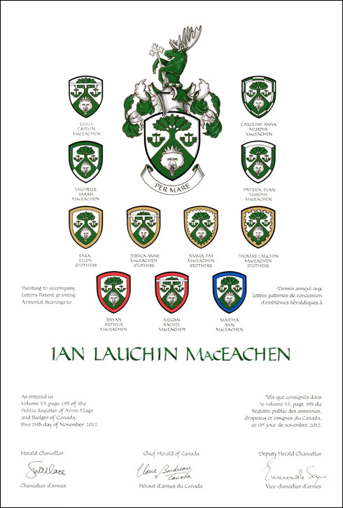Arms of Ian Lauchin MacEachenBlazonPer chevron Argent and Vert the apex terminating in an oak tree, in chief two lymphads and in base a bear’s face wearing an antique crown all counterchanged; SymbolismThe oak tree and lymphad appear in the arms of the chief of the Macdonalds of Clanranald, of which the MacEachens are a sept. The polar bear indicates that Mr. MacEachen belongs to the Canadian branch of the family. It wears a crown in reference to the mythical Kingdom of the Saguenay, the Saguenay region of Quebec being the birthplace of Mr. MacEachen and several of his siblings. |