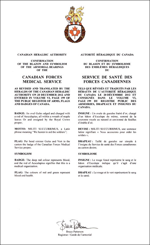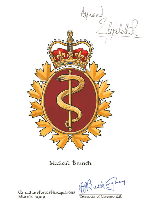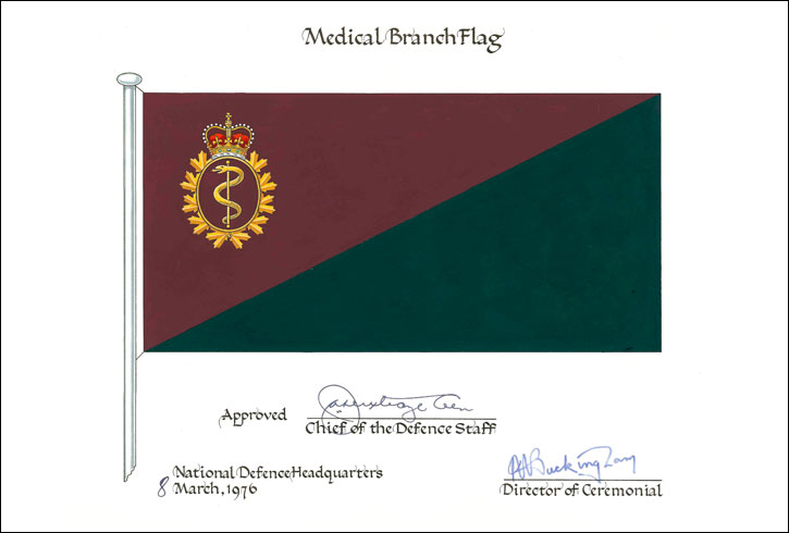 Additional InformationCreator(s)Not available PainterNot available CalligrapherNot applicable Recipient TypeMilitary Institution Other InformationThe badge was originally approved in March 1969 and the flag on 8 March 1976. See also the heraldic emblems approved under the names Royal Canadian Medical Service (Vol. VI, p. 264) and Royal Canadian Medical Service of the Canadian Armed Forces (Vol. VII, p. 138). |