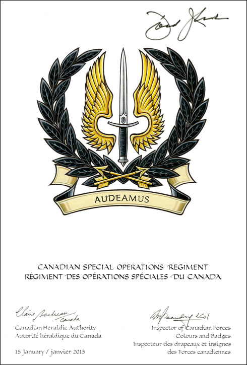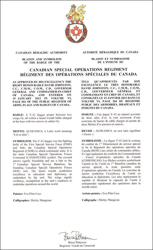 Badge of the Canadian Special Operations RegimentBlazonA V-42 dagger proper between two wings Or, all within a laurel wreath Sable charged at the base with two arrows in saltire Or; SymbolismThe V-42 dagger was the fighting knife of the First Special Service Force (FSSF) and links the Canadian Special Operations Regiment (CSOR) to allied commando units. It is the main Canadian Special Operations Forces Command (CANSOFCOM) symbol. The crossed arrows signify friendship and are a link to the 1st Canadian Special Service Battalion, the founding Canadian Special Operations Forces (SOF) unit. The laurel wreath symbolizes excellence in education and diplomacy as undertaken by the unit. The wings signify swiftness, exemplified in the unit’s readiness to undertake operations around the world. |