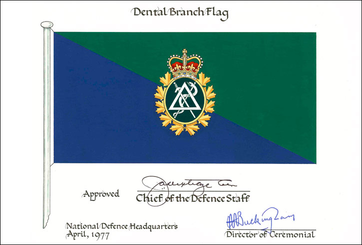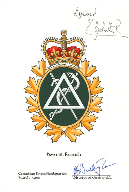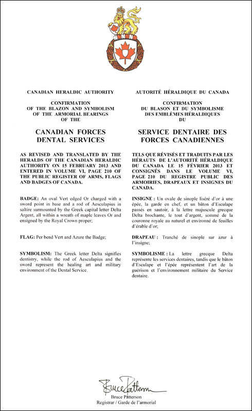 Badge of the Canadian Forces Dental ServicesBlazonAn oval Vert edged Or charged with a sword point in base and a rod of Aesculapius in saltire surmounted by the Greek capital letter Delta Argent, all within a wreath of maple leaves Or and ensigned by the Royal Crown proper; SymbolismThe Greek letter Delta signifies dentistry, while the rod of Aesculapius and the sword represent the healing art and military environment of the Dental Service. |