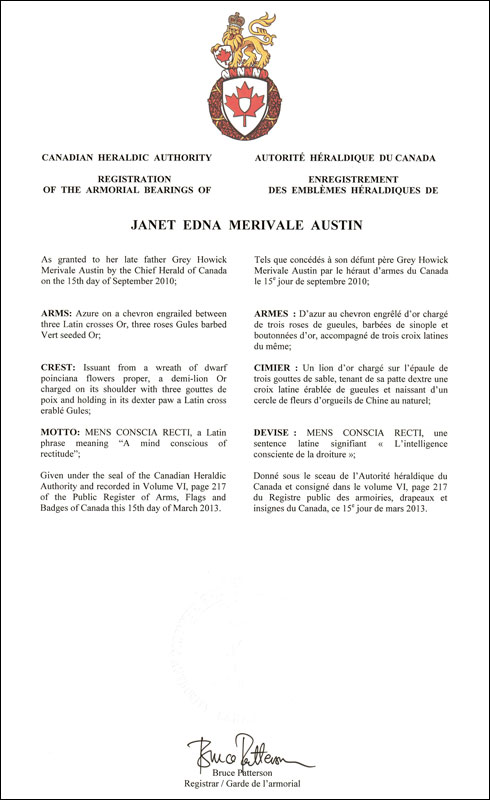 Additional InformationCreator(s)Original concept of Grey Austin and Forrest Pass, assisted by the heralds of the Canadian Heraldic Authority. PainterAudrey Joan Merrington CalligrapherShirley Mangione Recipient TypeIndividual Special DesignationLieutenant Governor Other InformationThe recipient's emblems were originally recorded in the name of Grey Howick Merivale Austin in the Public Register of Arms, Flags and Badges of Canada, Volume V, page 511, 15 September 2010. |