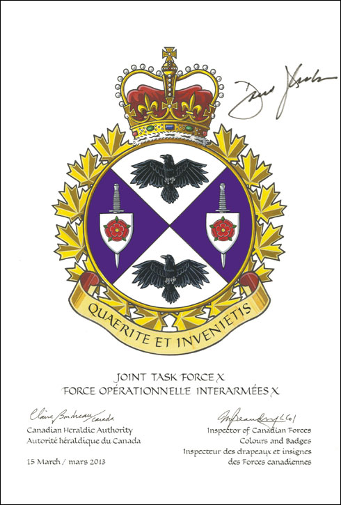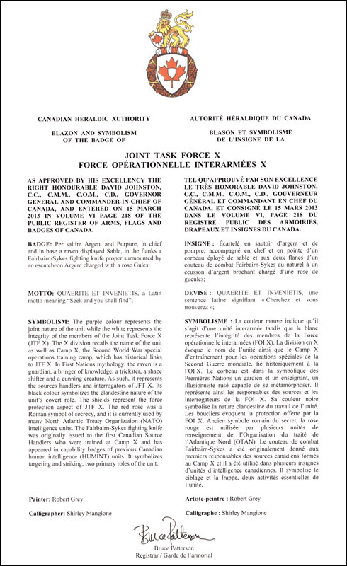 Badge of Joint Task Force XBlazonPer saltire Argent and Purpure, in chief and in base a raven displayed Sable, in the flanks a Fairbairn-Sykes fighting knife proper surmounted by an escutcheon Argent charged with a rose Gules; SymbolismThe purple colour represents the joint nature of the unit while the white represents the integrity of the members of the Joint Task Force X (JTF X). The X division recalls the name of the unit as well as Camp X, the Second World War special operations training camp, which has historical links to JTF X. In First Nations mythology, the raven is a guardian, a bringer of knowledge, a trickster, a shape shifter and a cunning creature. As such, it represents the sources handlers and interrogators of JFT X. Its black colour symbolizes the clandestine nature of the unit’s covert role. The shields represent the force protection aspect of JTF X. The red rose was a Roman symbol of secrecy, and it is currently used by many North Atlantic Treaty Organization (NATO) intelligence units. The Fairbairn-Sykes fighting knife was originally issued to the first Canadian Source Handlers who were trained at Camp X and has appeared in capability badges of previous Canadian human intelligence (HUMINT) units. It symbolizes targeting and striking, two primary roles of the unit. |