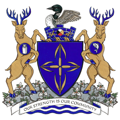CrestBlazonIssuant from a mural crown Azure masoned Argent charged with a roundel per saltire Argent, Or, Gules and Sable between two griffins’ claws Or, a loon rising wings elevated and addorsed proper; SymbolismThe loon is another feature of the township’s lakes. The mural coronet is a symbol of municipal authority. The yellow griffins’ claws on blue are based on the arms of the Comte de Frontenac (Governor of New France 1672-1682 and 1689-1698), for whom the township is named. The disc divided in four is a First Nations symbol, honouring the original Algonquin occupants of the region. |