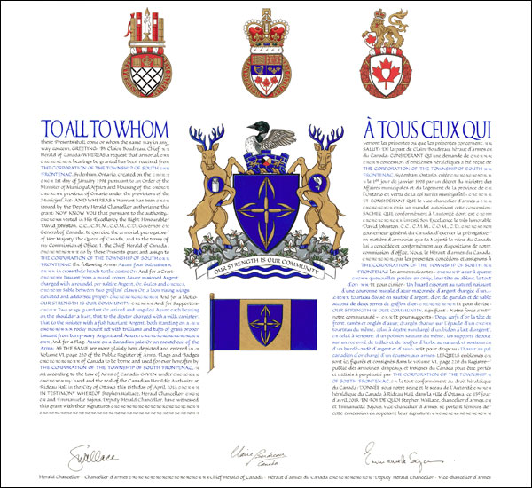 Additional InformationCreator(s)Original concept of Bruce Patterson, Deputy Chief Herald of Canada, assisted by the heralds of the Canadian Heraldic Authority. PainterPalina Klimava CalligrapherShirley Mangione Recipient TypeCivil Institution